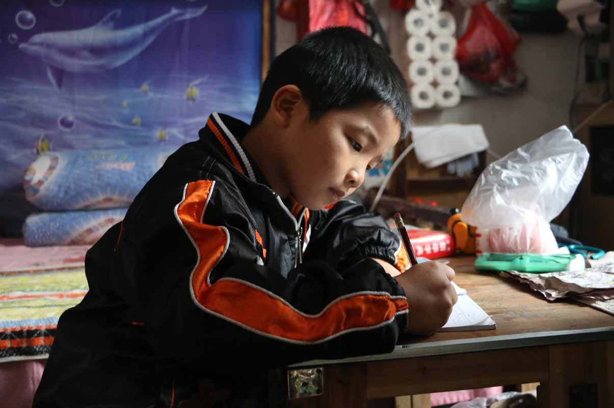 到赵中琰家时,门没有锁,我们便轻轻推门了进去。赵中琰正在写作文,题目是“我的数学课”,字迹干净工整。他对我们当中一些志愿者的面孔已经熟识,即使对于初次见面的志愿者,他也显得很平静友好。由于父母外出打工,经常不在身边,这个十一岁的孩子显得比同龄人更加沉稳、独立。