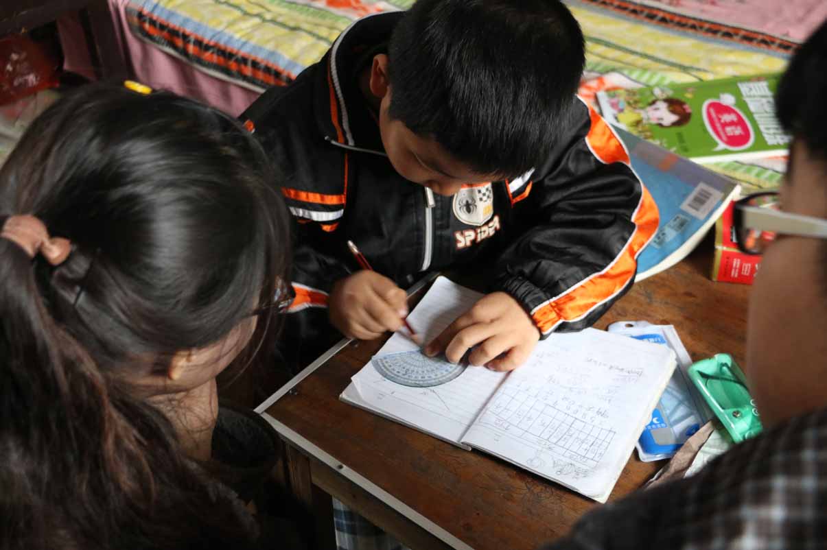 陪他一起温习了五个单元的英语课文后,大家又辅导他做数学题。他很诚实地告诉志愿者们,自己对于“平方米、公顷和平方千米”的换算不是很懂。这是一个很简单的小问题,但是大家还是用了许多方法为他讲解,希望他理解得更透彻一些。赵中琰还兴致勃勃地拿出量角器,自信满满地让我们考他“画角”,然后在本子上认认真真地画起来。志愿者们看着他认真的样子,也相视一笑。
