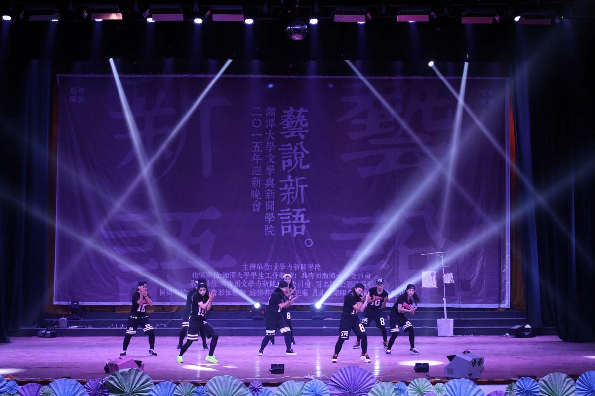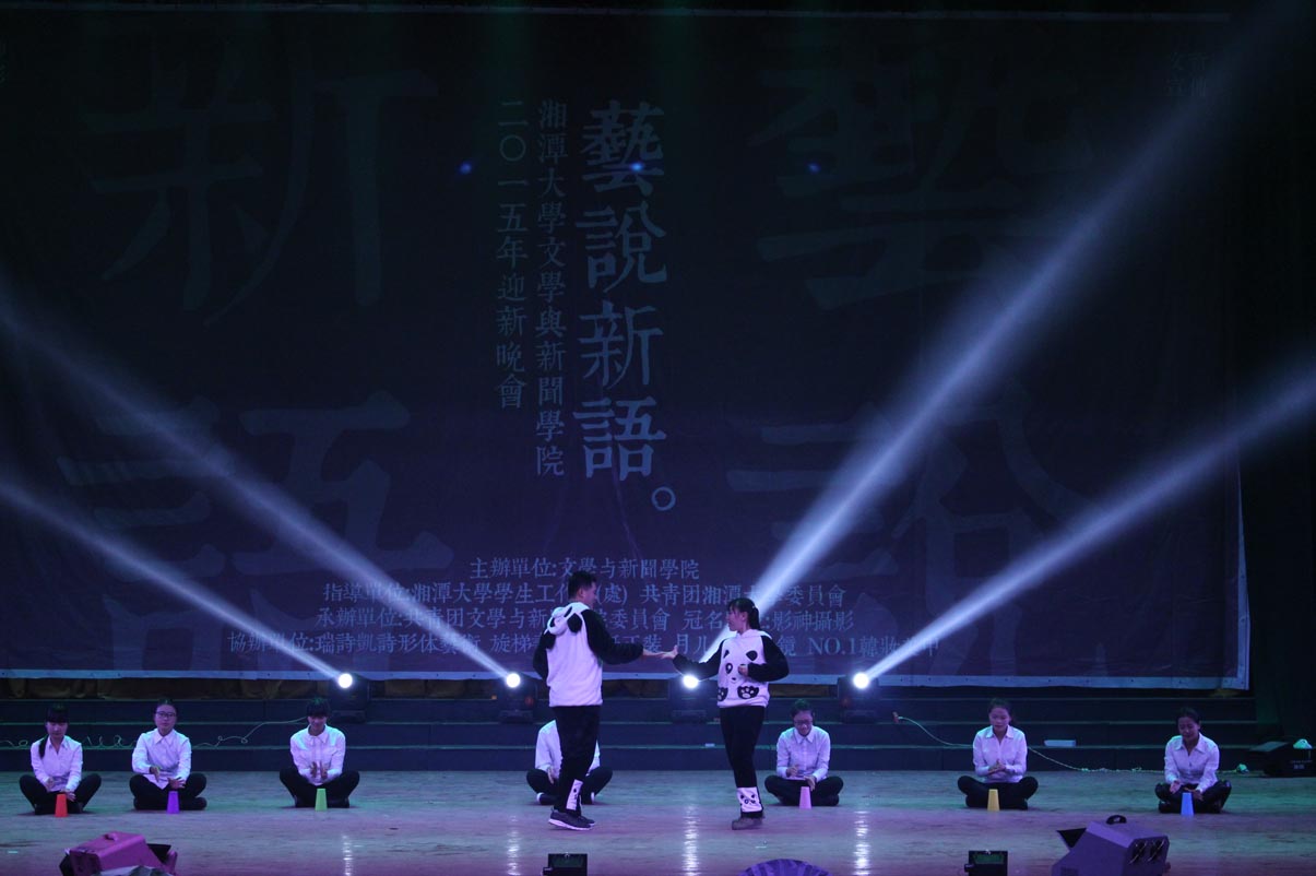 晚会在观众的倒数声与往年迎新晚会的视频回顾中开始。开场舞《聆风谣》,轻柔且大气的舞姿配以细腻且磅礴的音乐,梦幻的灯光配以迷离的烟雾,纤纤玉手中的折扇轻妙流转,一份古韵仿佛使人陷入一份古香古色的回忆当中;15广告2班的《Good Boy》则极富现代感,闪烁的灯光和动感的旋律为街舞表演的动感帅气增色不少;《奇趣逸舞》是由15广告1班,15中文1班和15中文3班共同带来的大型创意舞蹈串烧:由手影演绎的“梁祝”的凄美爱情、浪漫和谐的华尔兹,以及以欢快的童谣与杯子舞作背景音乐,身着黑白交替舞服的舞者带来的儿童游戏化舞蹈,为我们带来一幕幕视觉盛宴,表演结束后,台下掌声雷动。