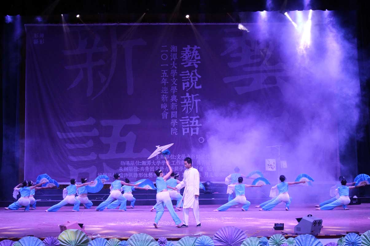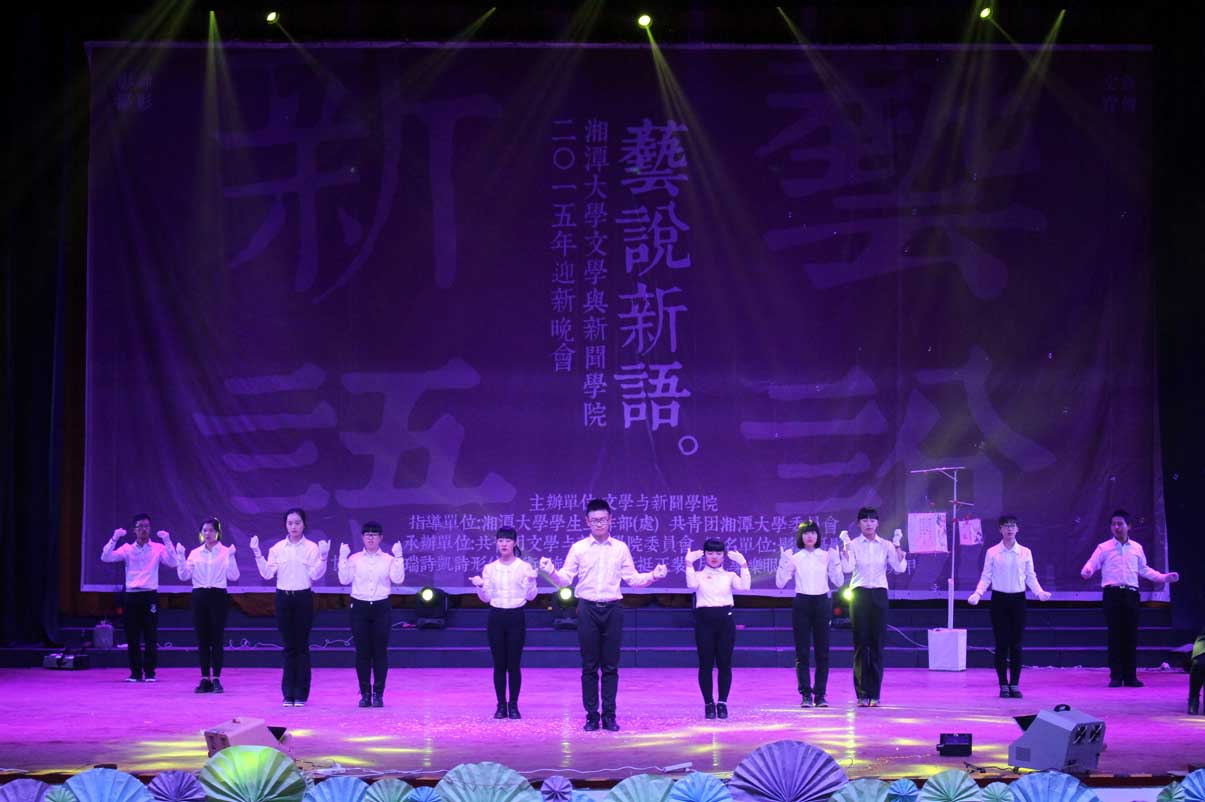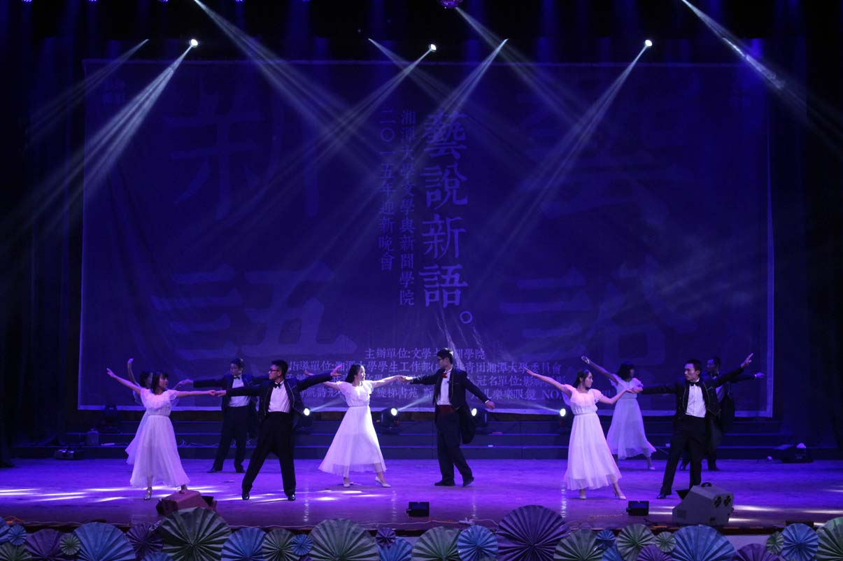 本场晚会舞蹈种类多样,现代、民族相映成趣。14中文2班带来了一曲傣族舞《女儿花》,以迷醉的蓝色灯光开场,独具民族特色的音乐为背景,灵动的少女们身着蓝裙、手持红花,显得格外美艳动人。暖场舞也由舞蹈串烧构成,在校园活力风与性感妖娆范中自如切换,令人耳目一新;14新闻系的舞者又在爵士舞《Can't Stop Dancing》中用她们的奔放热情演绎了永不停息的青春激情;手语社则为我们奉上了一场动人的手语舞《时间往前,爱情向后》,《南山南》、《一次就好》、《时间都去哪了》等歌曲配以优美的手语舞,为我们串起了一条生命的时间锁,诠释出”生命美好,你我当珍惜”的真谛。压轴舞蹈节目是由15广电1班带来的《清明上河图》,折扇合舞,乐音如潺潺流水般涤濯人的心灵,男女对舞,民族与拉丁巧妙融合,国风式舒缓舞姿搭配现代快节奏动感音乐......完美的古现代交汇恰是“艺说新语”的体现,让人印象深刻。