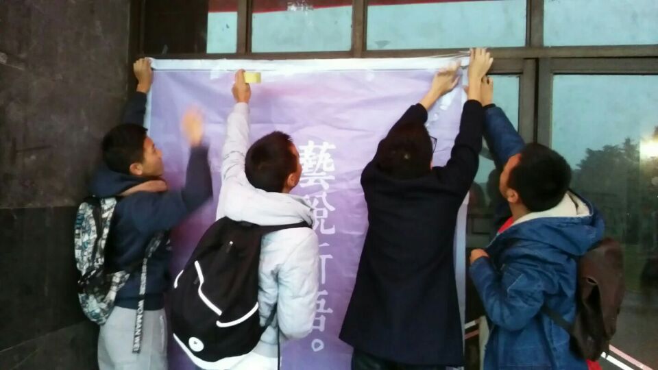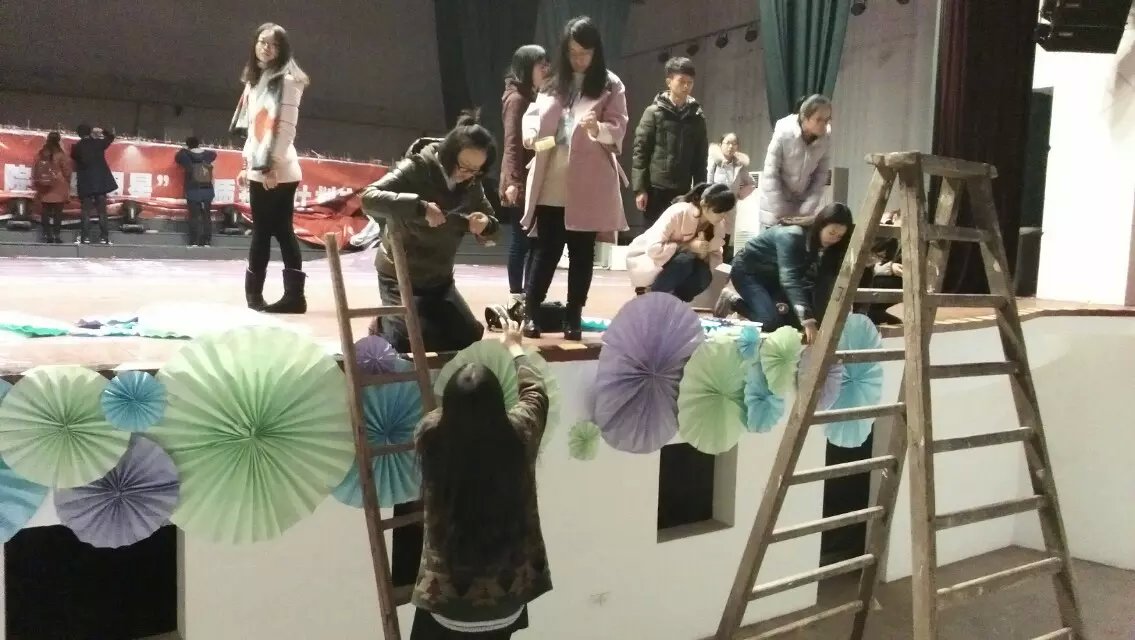 就在大家精心布置舞台的时候,俱乐部的老大爷突然冲了出来,“不行,不能粘!把这些都给我摘了,不能粘!”我们跟大爷耐心解释着,我们绝不破坏舞台刷好的油漆,可大爷仍不同意。几乎是经过多方周旋,最后的最后,它们依旧出现在了晚会的舞台上,天蓝、浅绿、淡紫,大小不一、错落有致地分布在台前。也许你会说,我们的舞台不够华丽。可我想说,大家努力争取才得以留下的这舞台,尽管不够华美,也是最美。