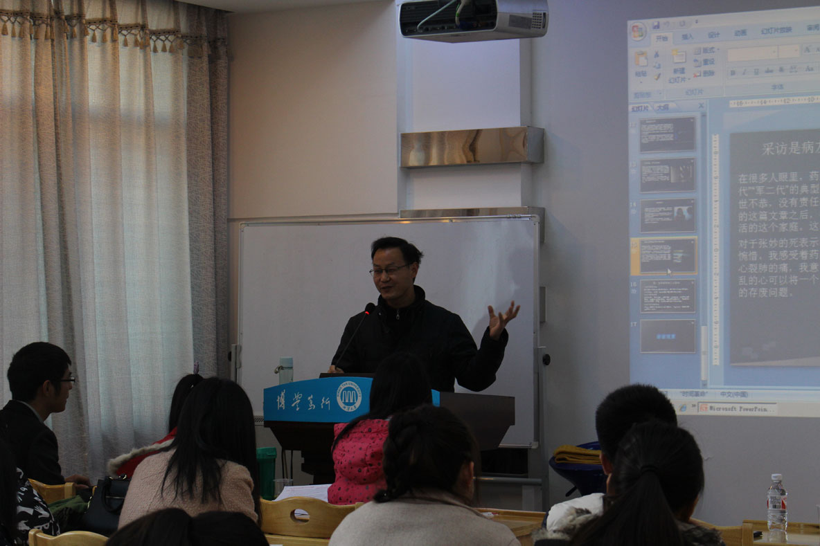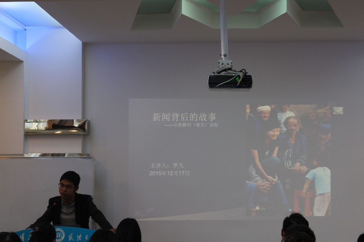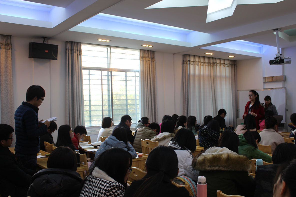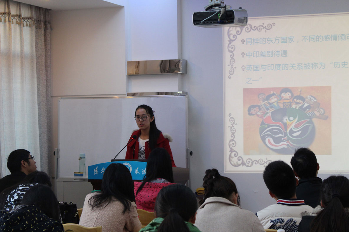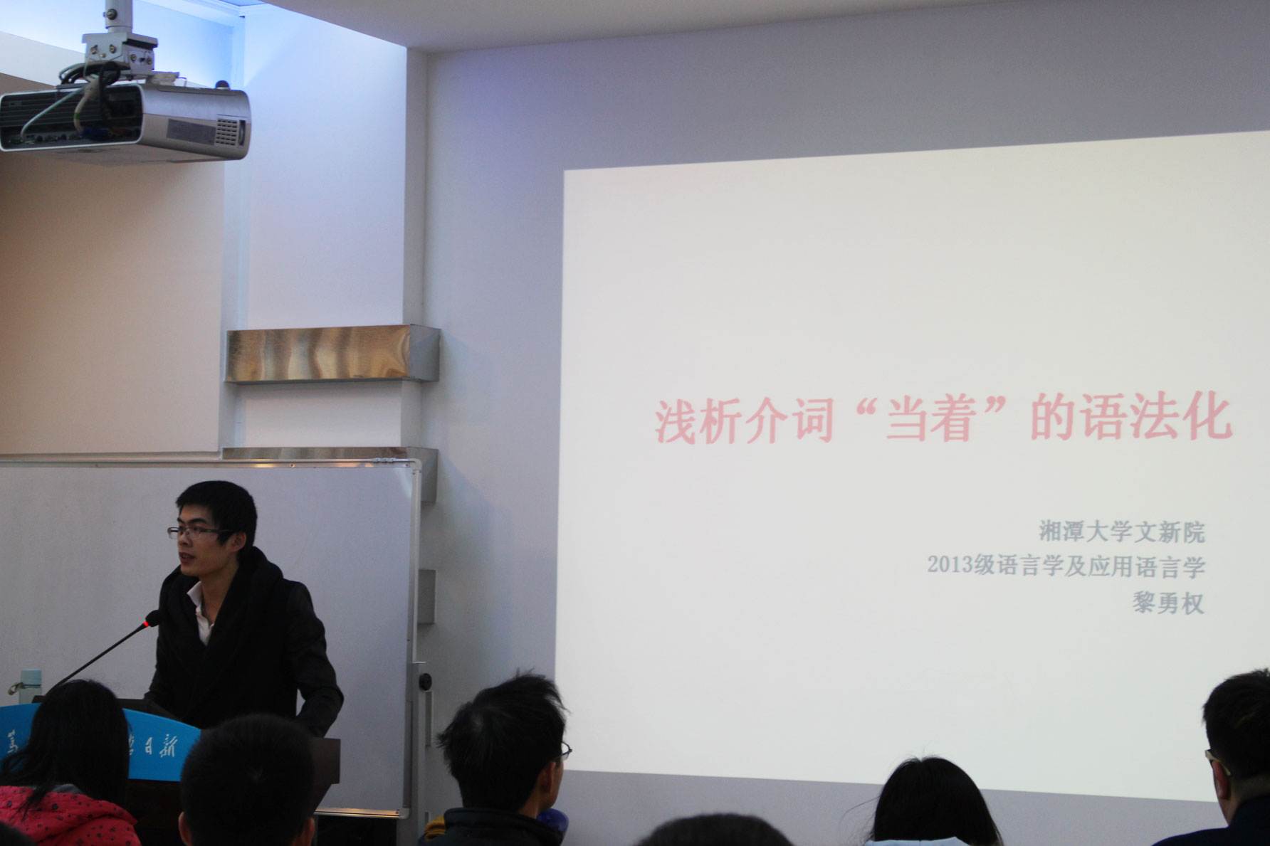 来自13级语言学的黎勇权率先发言,以“浅析‘当着’的语法化”为题,运用语言学的知识来探讨“当着”的语法化及其演变机制、“虚化”历程、带宾语情况。通过对语料的耙疏,从历时层面和共时的层面看到“当着”动词性的用法生命力。法公司的罗凡则把中文、新闻、法律结合到一起,从柴静的《看见》说起,探讨新闻背后的故事。通过对《看见》中的新闻故事分析阐述,给出关于新闻自己的看法,并认为新闻与法律是共通的,都需要多角度的观察,尽可能保证其客观性,关注事实真相。来自15级比较文学的赵梦雅所论述的是《刀锋》中的印度形象,其从毛姆塑造印度形象的缘由开始,讲述毛姆笔下一个与过去西方世界所认识的完全不一样的印度。这种对印度“神秘”的描写、对“艳情”的正名,是东西方之间一种有意义的跨文化尝试。三位主讲人的演讲引起了大家的浓厚兴趣和广泛提问,现场气氛活跃。符继成老师评价此次三位同学的演讲对我们每一个人的学术研究都是有极大的启发的,学术研究不仅仅是要在文学上而且是要在文化层面上,我们要多多注意文化与文学之间的联姻,把握学术研究的深度。