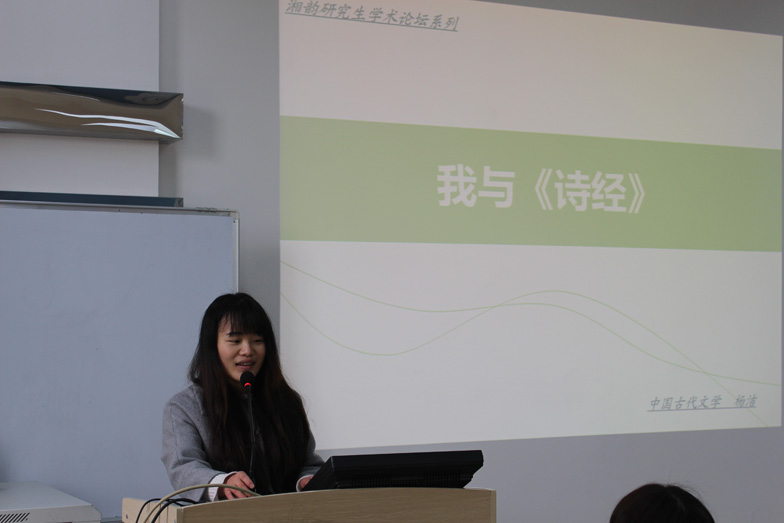 最后一位,主讲人是来自14级古代文学的杨洁。她结合自身的研究生经历,借以《诗经》为例告诉我们如何进行文本的选择和阅读;如何去寻找文本、确定文本;如何去解决库存问题。通过她自身的实践经验,总结出写论文的四个要点就是“多实践、多读书、多总结、多思考”。要沿着感兴趣的点不断地挖掘就能发现问题,同时发现问题便要及时动笔。