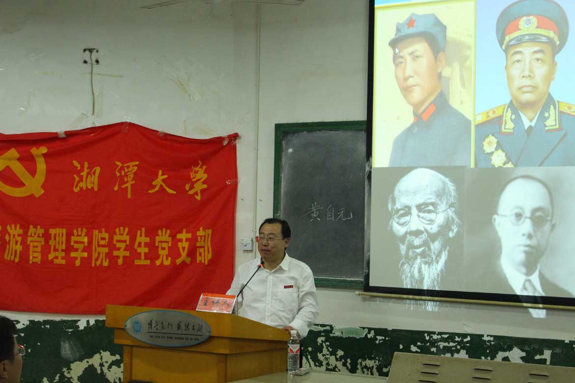 刘建平还说到湖南是中国抗战后方重要战略基地之一,而湘潭更是革命抗战的热土。“湖南素来都有浓厚的红色文化,这也是湖南一直引以为傲的特色之一。”今年恰好是抗战胜利70周年,这不禁又让人想起了几十年前的峥嵘岁月。为了纪念抗战,纪念伟人,他还现场唱起了红歌。浑厚悠扬的歌声飘荡在教室,令人陶醉。歌毕,现场想起了雷鸣般的掌声。