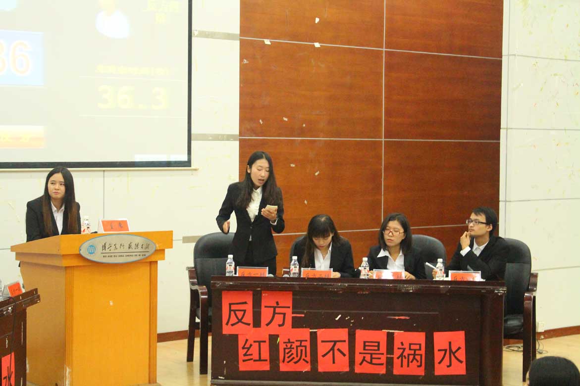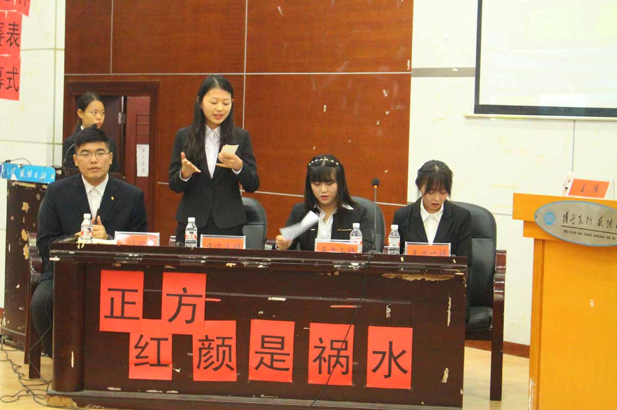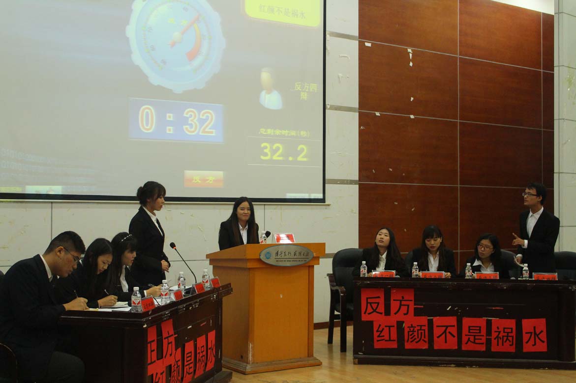 本次表演赛的主席是肖歌。正方的观点为:红颜是祸水。正方辩手为:一辩祁文娇,二辩凌依,三辩薛珊,四辩吴栋鹏。反方的观点为:红颜不是祸水。反方辩手为:一辩李贺,二辩余琼,三辩臧雪文,四辩冯明磊。