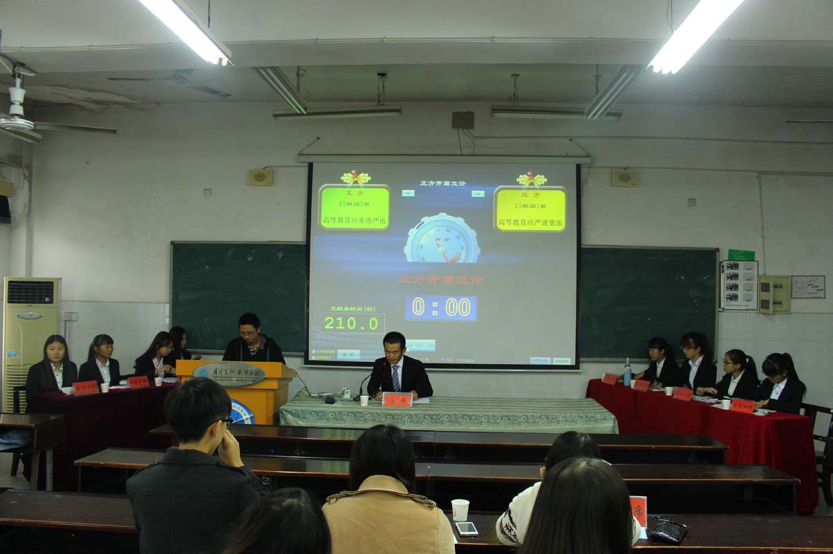 本次辩论赛的辩题是“高等教育应该‘严进宽出’还是‘严进宽出’”。新闻二班作为正方,观点为“赞同宽进严出”,辩手分别是一辩任玉颖,二辩于晨帼,三辩周雯雯,四辩刘婷。新闻一班为反方,观点为“赞同严进宽出”,辩手分别是一辩王子君,二辩陈缘,三辩周晓雪,四辩郭秀婷。