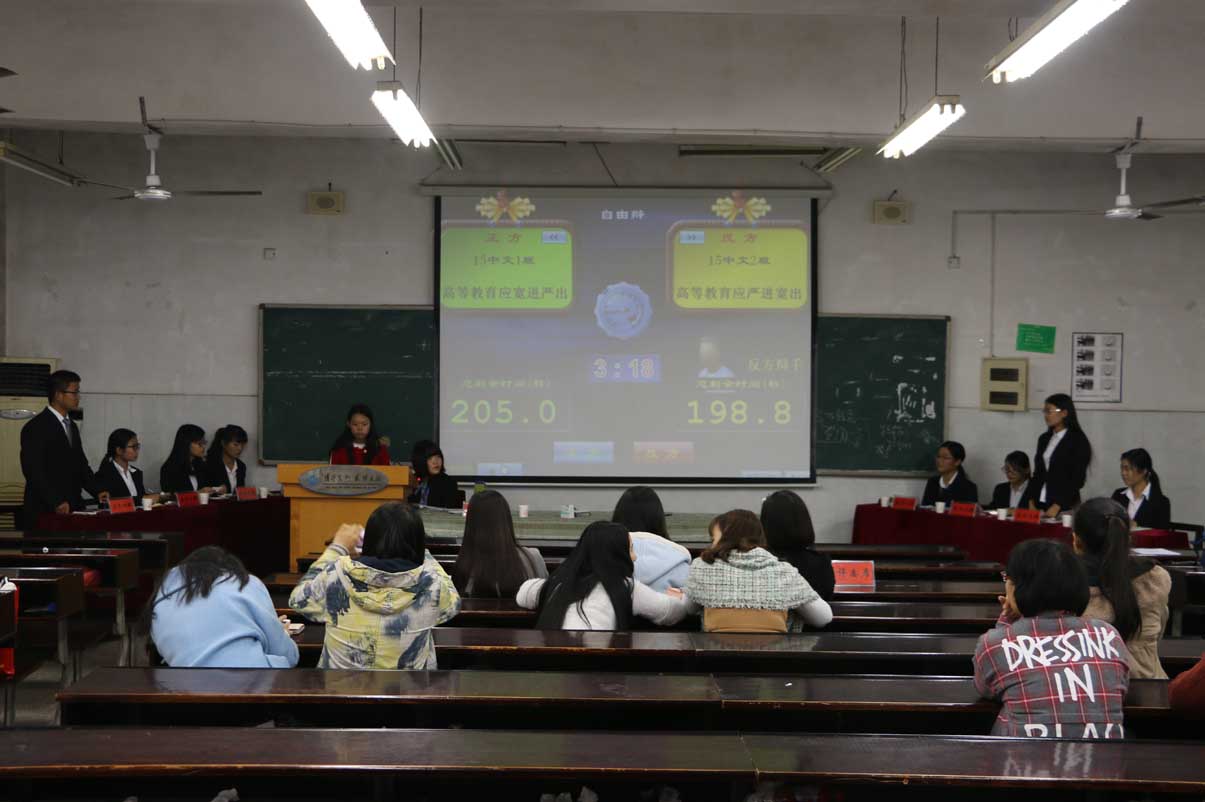 11月7日下午2:30,“文心杯”新生辩论赛在经管楼202教室拉开帷幕。辩论双方分别是,前者代表正方,支持"高等教育应宽进严出"的观点;后者代表反方,支持"高等教育应严进宽出"的观点。担任该场辩论赛评委的有翟晓灵,朱敏和敖君。最终,15中文一班的戴炜烨获优秀辩手称号,而15中文二班获得了本场辩论赛的胜利。