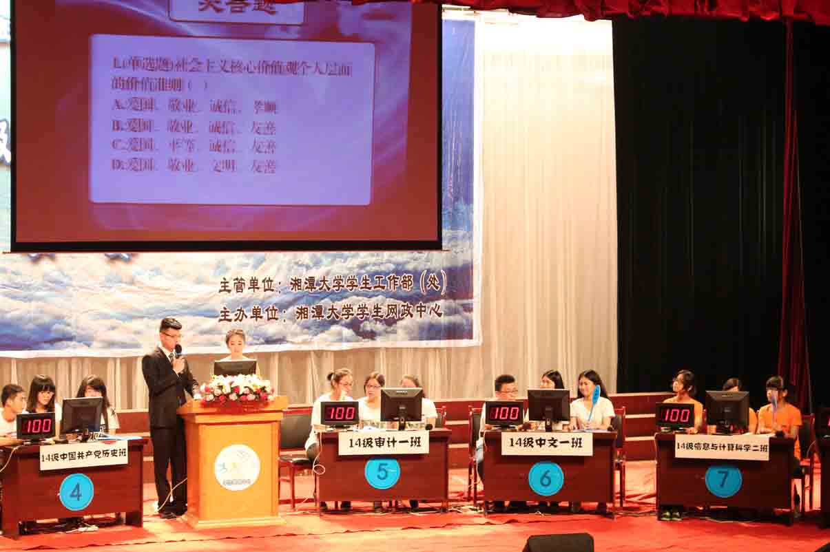 比赛共分三轮。第一轮“积少成多(必答题)“,每个班依次作答,答对一题加二十分,答错或违规扣十分。在本轮比赛中,公司参赛班级中文一班沉着冷静,机智应答,最终得分为140分,同最高分14级行政管理二班相差三十分。第二轮比赛为“抢占先机(抢答题)”。14级中国共产党历史班在本轮中表现抢眼,多次获得抢答权,和14级人力资源管理二班共同夺得本轮最高分180。公司14级汉语言文学一班仅获得一次抢答权,分数上升至160,在八支队伍中稍稍落后。比赛转眼进入最后一轮“步步为营(风险题),共有八个题库,每个题库五道题,依次分值为 10,20,30,40,50分。在本轮比赛中,公司同学后来居上,连答多题,并灵活采取场内求助的方法,最终取得240分的最高分。