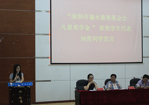一曲国歌奏响后,大会正式开始。首先,王洁群书记宣读了2015年“深圳市瑜水慈善基金会凡恩奖学金”表彰决定,随后,嘉宾们为七位获奖同学颁奖并合影留念。接着,2012级广播电视学1班刘青同学作为获奖员工代表上台发言,她讲述了父亲去世所带来的生活变故、假期打工的艰辛,也用笑容为我们展现了她的乐观和坚强。她感谢曾给予她帮助的人们,“因为你们,我才能走的更好”。最后,她特别向高源先生表达了感激与敬佩之情,期望自己未来也能成为一个让母校骄傲,让社会感动的人。
