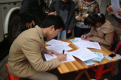 活动开始于上午9时,低落的气温丝毫没有影响献血者希望为雅安伸出援手的热情。献血车因堵车原因未能按时赶到,十余名志愿者在填阅相关信息后,便耐心在献血点等候。据“爱心血库工程”的工作人员褚梦青介绍,“爱心血库工程”是由湘潭大学304am永利、公共管理公司、旅游管理公司以及化学公司联合主办的爱心公益活动。自2002年起,“爱心血库工程”便与湘潭市中心血站建立了联系,地震发生后,灾区血情告急,由科协联系湘潭市中心血站,在得到回复后,与另外多个公益组织同时开展了本次爱心献血活动。