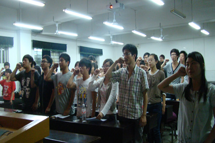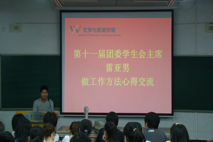 大会第二项,第十二届团委员工会第二团委副书记谭雅文就如何提高应用文写作能力做了简单的指导。首先谭雅文同学利用两个小问题在现场营造出轻松的气氛。文书的写作规范,之前已经下发给各部部长,谭雅文同学做了简单的解释和细节之处的指正,同时倡导大家在策划方面进行更多的创新。介绍公文书规范后,谭雅文同学还介绍了自己做学习部部长的经验,从部长与副部长的交流谈到部门建设,使得大家受益颇多。