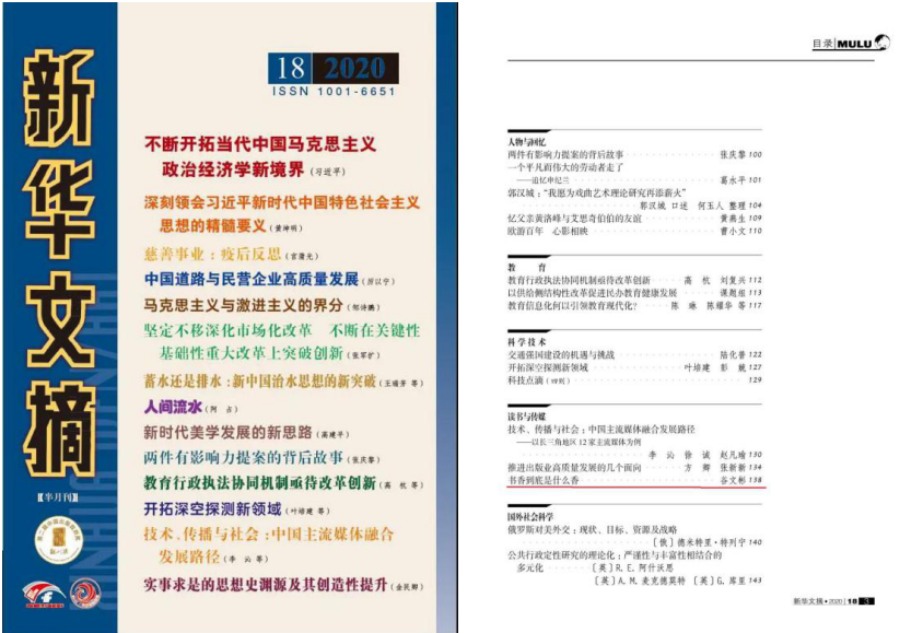 近日,公司青年教师谷文彬博士的论文《书香到底是什么香》(原载《光明日报》2020年6月26日《书香到底是什么香》)被国家权威转载刊物、校定一类期刊《新华文摘》全文转载(2020年第18期)。
